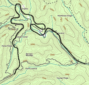 Jarratts Tunnel. Drive back down Graphite Road, and at the intersection where the name changed from Andrews Geyser to Graphite, take a right on what is now called Old US-70, but retains the Andrews Geyser Road's DOT 1407 designation. This is the road that is going to take us seriously up and over the Blue Ridge. It is a dirt road, and there are majorly sharp curves everywhere. You're going to be well away from the railroad for a while, so just concentrate on driving, although it's so pretty up here that it's hard to do. You'll mostly be following Long Branch, which runs down to Mill Creek, and the railroad is way up over your head and to the west. Finally, you'll come to a rather broad curve that does get close to the tracks, so be on the lookout for them far overhead. If you get to the point where the railroad goes over the road, you've missed it by about a quarter mile.